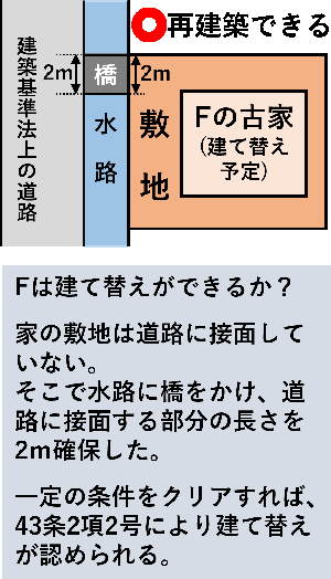 この特例は「43条但し書き」と呼ばれているが、現在は「43条2項2号」に改められている。再建築の可否は建築指導課で調べます。